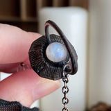 This copper electroformed Quartz Pendulum is adorned with a flashy Rainbow Moonstone and is designed specifically for powerful energy work. Quartz is a power stone. It directs and amplifies energy, and is beneficial for healing, meditation, and protection. Most of all, quartz is wonderful for harmonizing and balancing one's environment. It also energizes other crystals. The copper it’s made with is a highly conductive element that amplifies the energy of crystals, and it will aid you with your energy work. It’s hung on a 6” copper chain adorned with a Quartz gemstone.