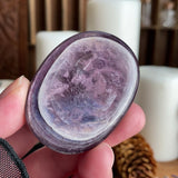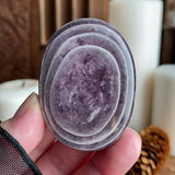 This beautiful, gem grade Lepidolite palm stone has a dreamy purple tone and a water ripple wave pattern. It’s highly chatoyant glimmer is revealed as it moves about in the light. It measures 2.1” x 1.5” x 0.6” and comes in it’s own black velvet carrying pouch.