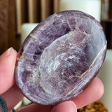 This large, gem grade Lepidolite palm stone has a beautiful purple tone and a dreamy chatoyant glimmer as it moves about in the light. It measures 2.25” x 1.7” x 0.5” and comes in it’s own black velvet carrying pouch.
